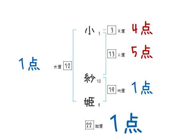 天運![]() | 小紗姫さんの天運は3画の4つ星!活動的で才能に恵まれ、多くの信頼を得る。希望に満ち成長する。 家系が持つ宿命的な運勢を表します。祖先から受け継いだ苗字ですので自分の力が及びません。家柄を象徴します。 |