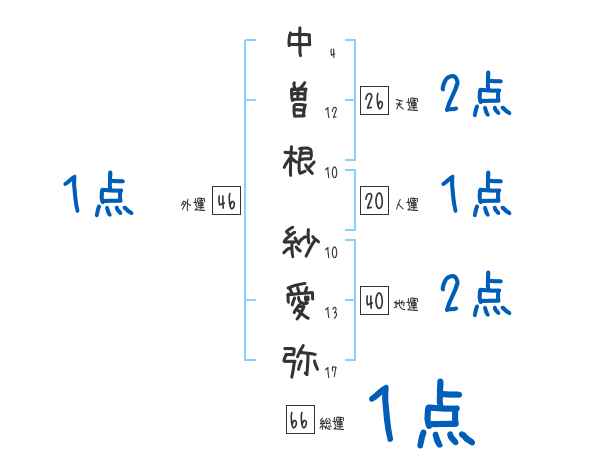 総運![]() | 中曽根紗愛弥さんの総運は66画の1つ星!迷うことが多く挫折しやすい傾向が。辛抱強く物事に取り組みましょう。 あなたの人生を表す1番重要な運勢です。生涯を通じて影響する総合運となり、主に50歳以降の晩年期に影響を及ぼします。 |