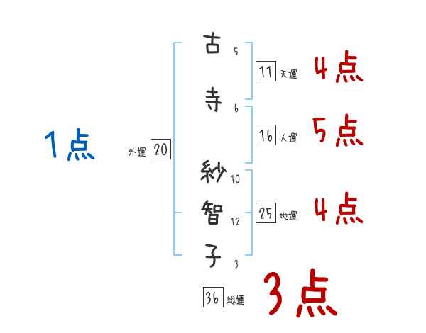 総運![]() | 古寺紗智子さんの総運は36画の3つ星!先見性が豊かです。多少神経質で苦労することも。 あなたの人生を表す1番重要な運勢です。生涯を通じて影響する総合運となり、主に50歳以降の晩年期に影響を及ぼします。 |