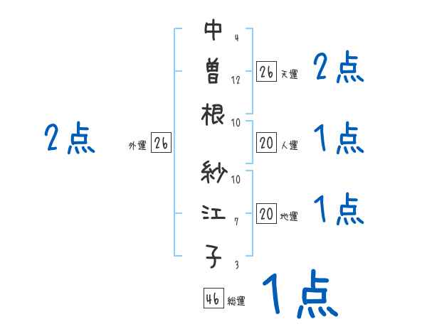 外運![]() | 中曽根紗江子さんの外運は26画の2つ星!波瀾万丈かも。信頼できる人を大事にしましょう。 生活面を象徴する運勢です。外部から受ける影響力を表し、結婚運、家庭運や職場、環境への順応性を表します。 |