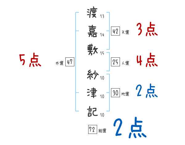人運![]() | 渡嘉敷紗津記さんの人運は25画の4つ星!個性があり才能があふれる。強運の持ち主で発展する。 性格や才能などを表す2番目に重要な運勢です。人間関係や協調性、社会的な成功に影響します。主に20歳から50歳ぐらいまでの中年期の運勢を表します。 |