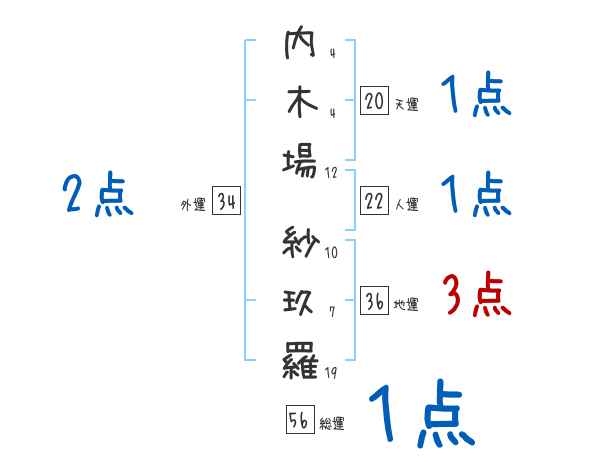 外運![]() | 内木場紗玖羅さんの外運は34画の2つ星!独創性に優れるが、自尊心が強く災難に注意しましょう。 生活面を象徴する運勢です。外部から受ける影響力を表し、結婚運、家庭運や職場、環境への順応性を表します。 |