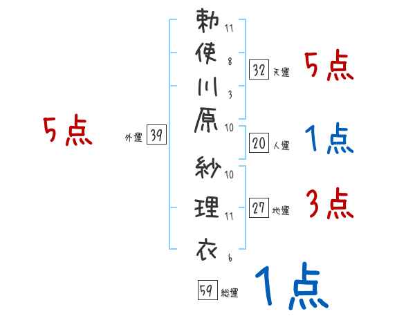 外運![]() | 勅使川原紗理衣さんの外運は39画の5つ星!社交性に優れ人望が厚い。人の上に立ち成功する。 生活面を象徴する運勢です。外部から受ける影響力を表し、結婚運、家庭運や職場、環境への順応性を表します。 |