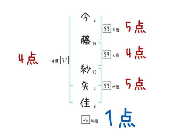天運![]() | 今藤紗矢佳さんの天運は23画の5つ星!想像力に優れ活力がある。一代で成功し名誉を手に入れる。 家系が持つ宿命的な運勢を表します。祖先から受け継いだ苗字ですので自分の力が及びません。家柄を象徴します。 |