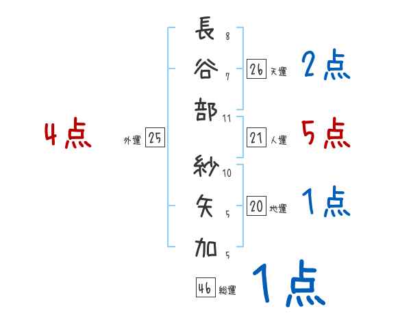 天運![]() | 長谷部紗矢加さんの天運は26画の2つ星!波瀾万丈かも。信頼できる人を大事にしましょう。 家系が持つ宿命的な運勢を表します。祖先から受け継いだ苗字ですので自分の力が及びません。家柄を象徴します。 |