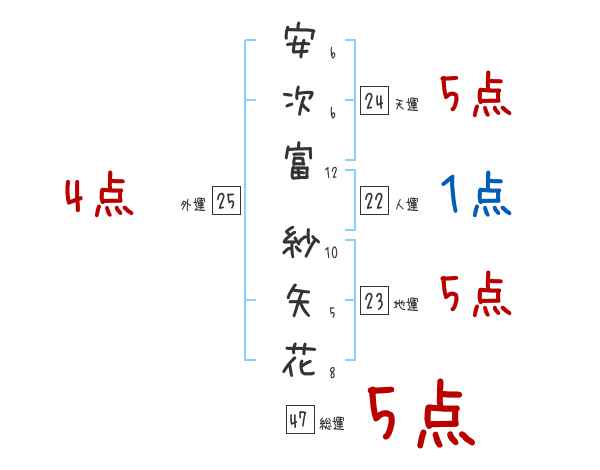 天運![]() | 安次富紗矢花さんの天運は24画の5つ星!家庭運が良く順調な人生。金運にも恵まれる。 家系が持つ宿命的な運勢を表します。祖先から受け継いだ苗字ですので自分の力が及びません。家柄を象徴します。 |