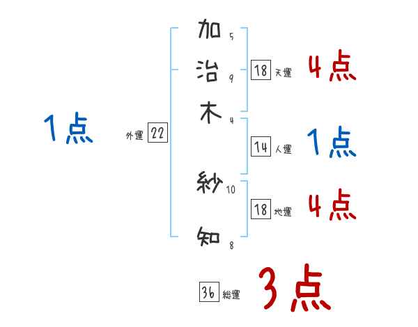 天運![]() | 加治木紗知さんの天運は18画の4つ星!情熱的で剛気。忍耐力があり信頼される。 家系が持つ宿命的な運勢を表します。祖先から受け継いだ苗字ですので自分の力が及びません。家柄を象徴します。 |