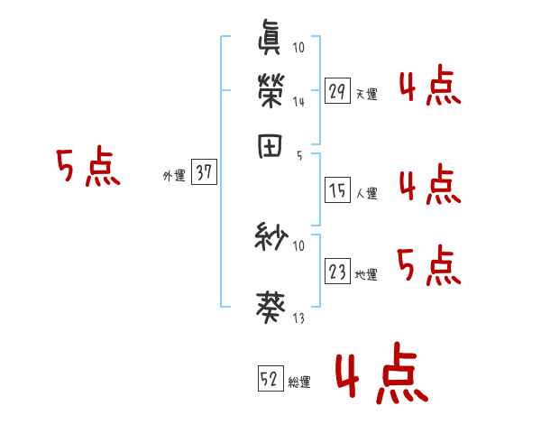 天運![]() | 眞榮田紗葵さんの天運は29画の4つ星!完全主義で才能がある。厳格な心の持ち主。 家系が持つ宿命的な運勢を表します。祖先から受け継いだ苗字ですので自分の力が及びません。家柄を象徴します。 |