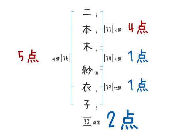 天運![]() | 二本木紗衣子さんの天運は11画の4つ星!着実に富や地位を得る幸運な人生。 家系が持つ宿命的な運勢を表します。祖先から受け継いだ苗字ですので自分の力が及びません。家柄を象徴します。 |