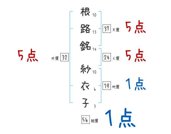 外運![]() | 根路銘紗衣子さんの外運は32画の5つ星!柔軟性があり成功する。チャンスが多く金運が良い。 生活面を象徴する運勢です。外部から受ける影響力を表し、結婚運、家庭運や職場、環境への順応性を表します。 |