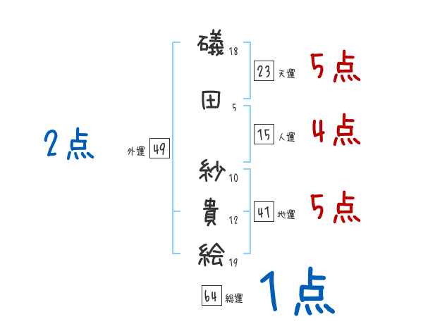 天運![]() | 礒田紗貴絵さんの天運は23画の5つ星!想像力に優れ活力がある。一代で成功し名誉を手に入れる。 家系が持つ宿命的な運勢を表します。祖先から受け継いだ苗字ですので自分の力が及びません。家柄を象徴します。 |
