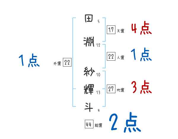 総運![]() | 田淵紗輝斗さんの総運は44画の2つ星!誠実で慎重な性格。物事を考えすぎないように注意しましょう。 あなたの人生を表す1番重要な運勢です。生涯を通じて影響する総合運となり、主に50歳以降の晩年期に影響を及ぼします。 |