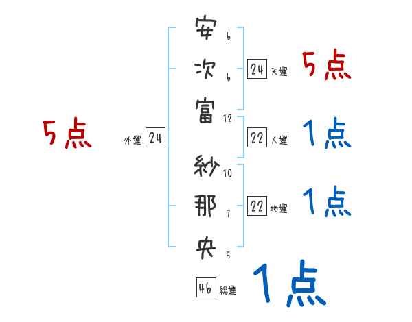 外運![]() | 安次富紗那央さんの外運は24画の5つ星!家庭運が良く順調な人生。金運にも恵まれる。 生活面を象徴する運勢です。外部から受ける影響力を表し、結婚運、家庭運や職場、環境への順応性を表します。 |