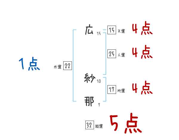 天運![]() | 広紗那さんの天運は15画の4つ星!人徳があり出世する。順調に物事を進め円満な人生。 家系が持つ宿命的な運勢を表します。祖先から受け継いだ苗字ですので自分の力が及びません。家柄を象徴します。 |
