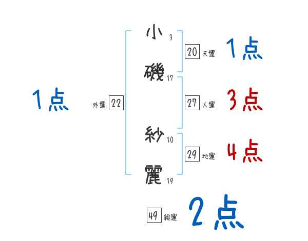 外運![]() | 小磯紗麗さんの外運は22画の1つ星!努力することが苦手ないっぽう手先が器用。芸術性にも優れる。 生活面を象徴する運勢です。外部から受ける影響力を表し、結婚運、家庭運や職場、環境への順応性を表します。 |