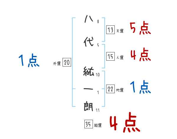 天運![]() | 八代紘一朗さんの天運は13画の5つ星!才能に恵まれ人気がある。名声を手に入れる。円満な人生。 家系が持つ宿命的な運勢を表します。祖先から受け継いだ苗字ですので自分の力が及びません。家柄を象徴します。 |