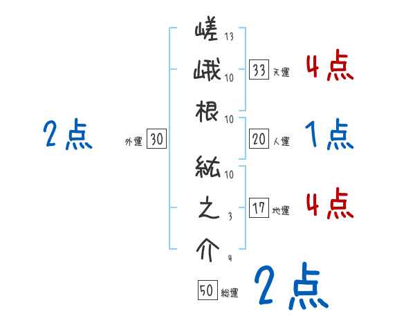 総運![]() | 嵯峨根紘之介さんの総運は50画の2つ星!浮き沈みが激しく不安定。しりすぼみに衰退しやすいので注意しましょう。 あなたの人生を表す1番重要な運勢です。生涯を通じて影響する総合運となり、主に50歳以降の晩年期に影響を及ぼします。 |