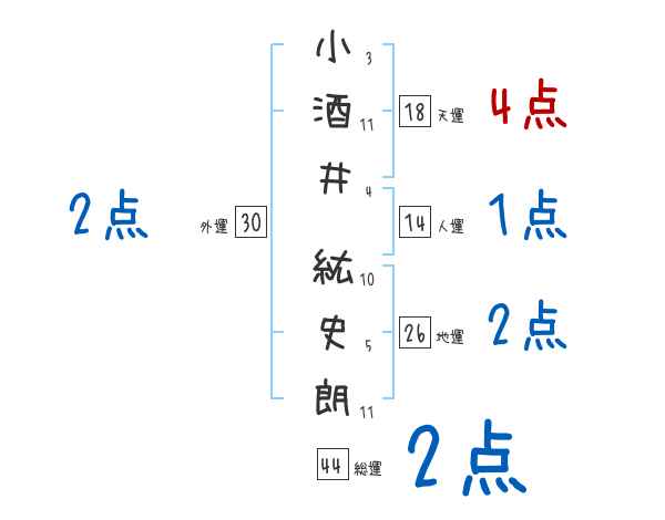 総運![]() | 小酒井紘史朗さんの総運は44画の2つ星!誠実で慎重な性格。物事を考えすぎないように注意しましょう。 あなたの人生を表す1番重要な運勢です。生涯を通じて影響する総合運となり、主に50歳以降の晩年期に影響を及ぼします。 |