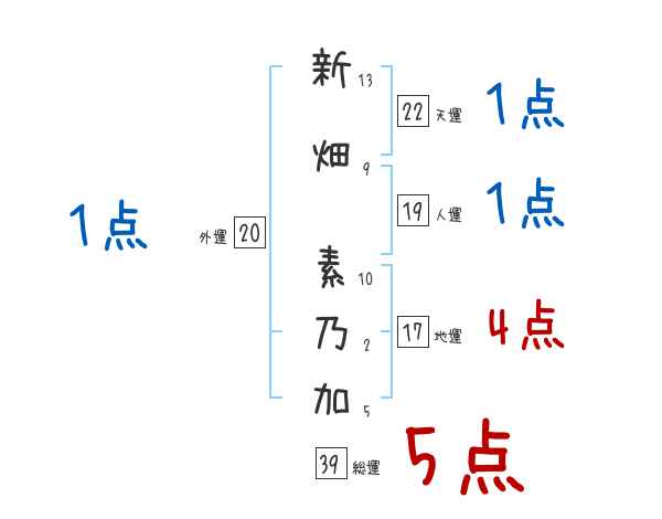天運![]() | 新畑素乃加さんの天運は22画の1つ星!努力することが苦手ないっぽう手先が器用。芸術性にも優れる。 家系が持つ宿命的な運勢を表します。祖先から受け継いだ苗字ですので自分の力が及びません。家柄を象徴します。 |