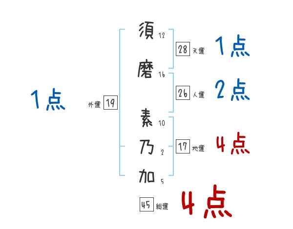 天運![]() | 須磨素乃加さんの天運は28画の1つ星!家庭環境に注意。スポーツで活躍できる能力があるかも。 家系が持つ宿命的な運勢を表します。祖先から受け継いだ苗字ですので自分の力が及びません。家柄を象徴します。 |