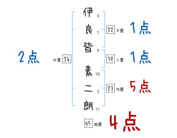外運![]() | 伊良皆素二朗さんの外運は26画の2つ星!波瀾万丈かも。信頼できる人を大事にしましょう。 生活面を象徴する運勢です。外部から受ける影響力を表し、結婚運、家庭運や職場、環境への順応性を表します。 |