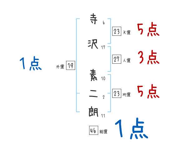天運![]() | 寺沢素二朗さんの天運は23画の5つ星!想像力に優れ活力がある。一代で成功し名誉を手に入れる。 家系が持つ宿命的な運勢を表します。祖先から受け継いだ苗字ですので自分の力が及びません。家柄を象徴します。 |