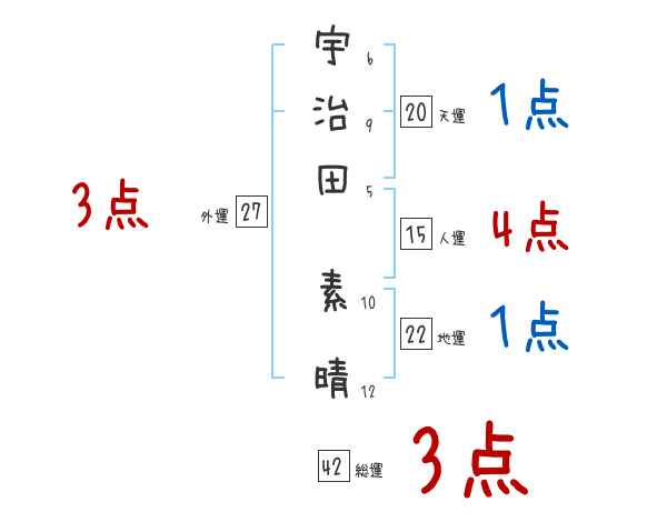 総運![]() | 宇治田素晴さんの総運は42画の3つ星!病気に注意。多芸であるが消極的でおとなしい。 あなたの人生を表す1番重要な運勢です。生涯を通じて影響する総合運となり、主に50歳以降の晩年期に影響を及ぼします。 |