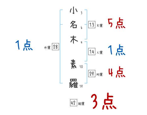 天運![]() | 小名木素羅さんの天運は13画の5つ星!才能に恵まれ人気がある。名声を手に入れる。円満な人生。 家系が持つ宿命的な運勢を表します。祖先から受け継いだ苗字ですので自分の力が及びません。家柄を象徴します。 |