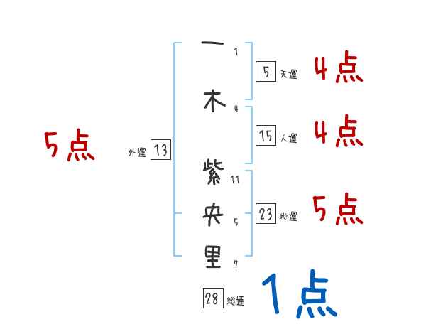 天運![]() | 一木紫央里さんの天運は5画の4つ星!健康で安泰。協調性に優れ、財産に恵まれる。 家系が持つ宿命的な運勢を表します。祖先から受け継いだ苗字ですので自分の力が及びません。家柄を象徴します。 |