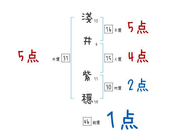 天運![]() | 淺井紫穏さんの天運は16画の5つ星!人望が厚く大きく発展する。逆転成功が見える。 家系が持つ宿命的な運勢を表します。祖先から受け継いだ苗字ですので自分の力が及びません。家柄を象徴します。 |