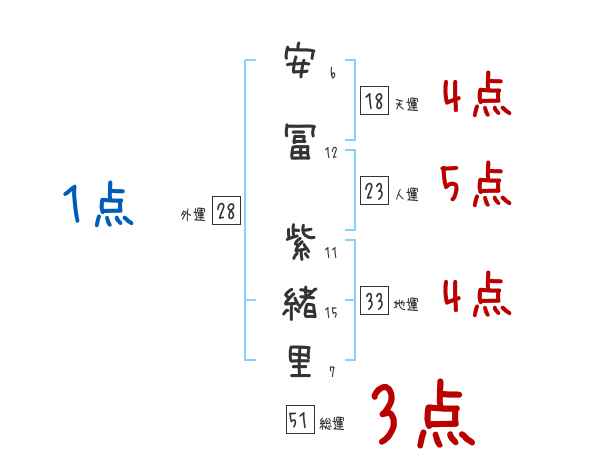 総運![]() | 安冨紫緒里さんの総運は51画の3つ星!変化が激しく、危険に注意。堅実な性格。 あなたの人生を表す1番重要な運勢です。生涯を通じて影響する総合運となり、主に50歳以降の晩年期に影響を及ぼします。 |