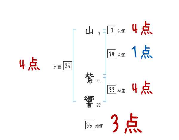天運![]() | 山紫響さんの天運は3画の4つ星!活動的で才能に恵まれ、多くの信頼を得る。希望に満ち成長する。 家系が持つ宿命的な運勢を表します。祖先から受け継いだ苗字ですので自分の力が及びません。家柄を象徴します。 |