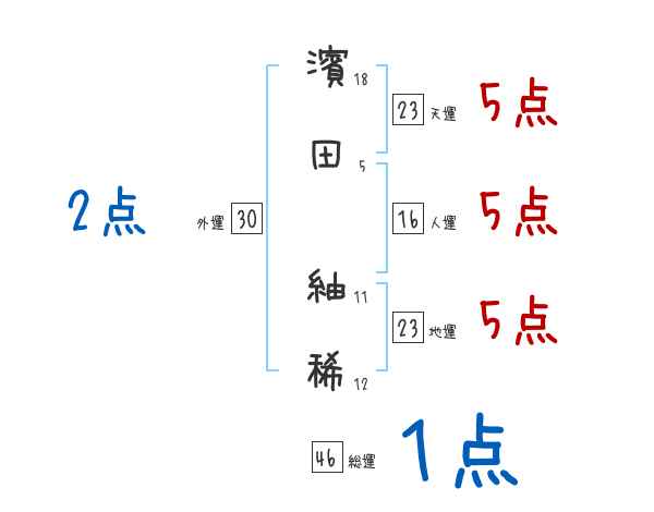 天運![]() | 濱田紬稀さんの天運は23画の5つ星!想像力に優れ活力がある。一代で成功し名誉を手に入れる。 家系が持つ宿命的な運勢を表します。祖先から受け継いだ苗字ですので自分の力が及びません。家柄を象徴します。 |