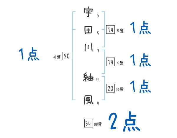 天運![]() | 宇田川紬風さんの天運は14画の1つ星!人に対して優しいがストレスを溜め込みがち。人間関係のトラブルを避けるよう気をつけましょう。 家系が持つ宿命的な運勢を表します。祖先から受け継いだ苗字ですので自分の力が及びません。家柄を象徴します。 |