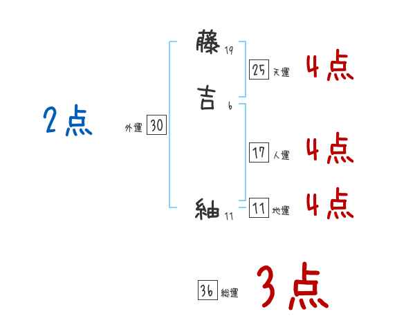 総運![]() | 藤吉紬さんの総運は36画の3つ星!先見性が豊かです。多少神経質で苦労することも。 あなたの人生を表す1番重要な運勢です。生涯を通じて影響する総合運となり、主に50歳以降の晩年期に影響を及ぼします。 |