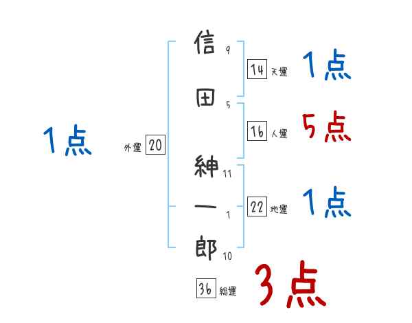 人運![]() | 信田紳一郎さんの人運は16画の5つ星!人望が厚く大きく発展する。逆転成功が見える。 性格や才能などを表す2番目に重要な運勢です。人間関係や協調性、社会的な成功に影響します。主に20歳から50歳ぐらいまでの中年期の運勢を表します。 |