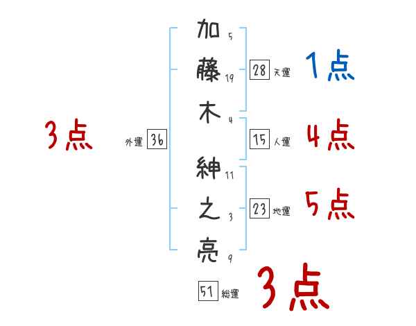 総運![]() | 加藤木紳之亮さんの総運は51画の3つ星!変化が激しく、危険に注意。堅実な性格。 あなたの人生を表す1番重要な運勢です。生涯を通じて影響する総合運となり、主に50歳以降の晩年期に影響を及ぼします。 |