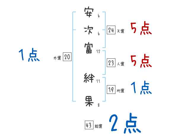 天運![]() | 安次富絆果さんの天運は24画の5つ星!家庭運が良く順調な人生。金運にも恵まれる。 家系が持つ宿命的な運勢を表します。祖先から受け継いだ苗字ですので自分の力が及びません。家柄を象徴します。 |