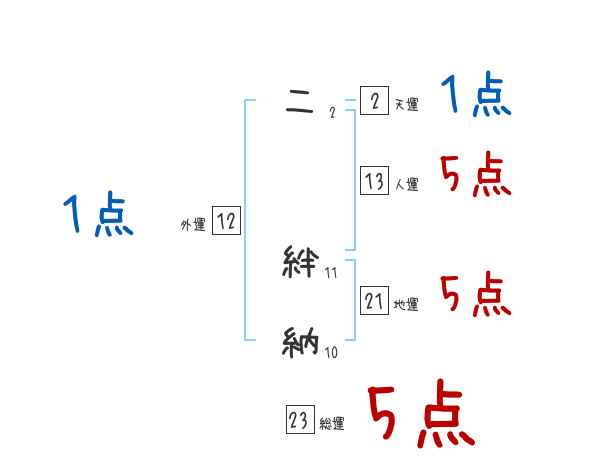 総運![]() | 二絆納さんの総運は23画の5つ星!想像力に優れ活力がある。一代で成功し名誉を手に入れる。 あなたの人生を表す1番重要な運勢です。生涯を通じて影響する総合運となり、主に50歳以降の晩年期に影響を及ぼします。 |