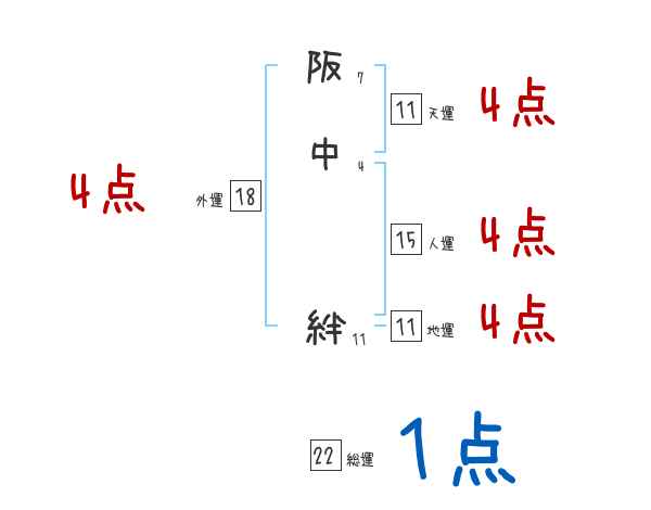 天運![]() | 阪中絆さんの天運は11画の4つ星!着実に富や地位を得る幸運な人生。 家系が持つ宿命的な運勢を表します。祖先から受け継いだ苗字ですので自分の力が及びません。家柄を象徴します。 |