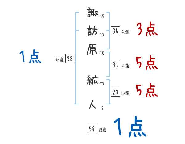 総運![]() | 諏訪原絋人さんの総運は59画の1つ星!意志の弱さであきらめることが多いかも。粘り強さが必要。 あなたの人生を表す1番重要な運勢です。生涯を通じて影響する総合運となり、主に50歳以降の晩年期に影響を及ぼします。 |