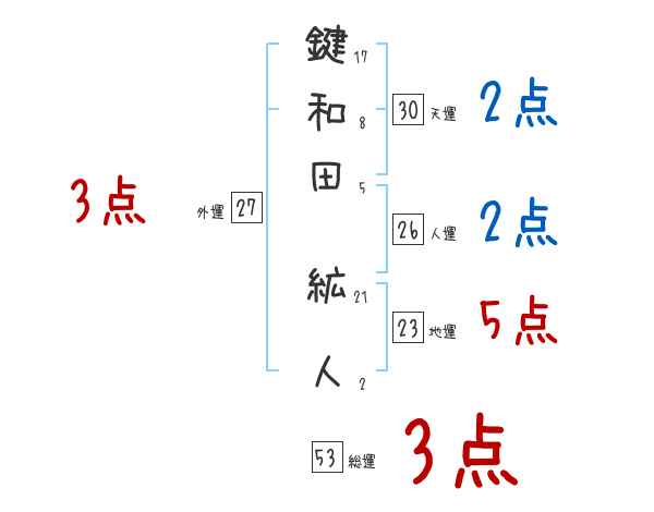 総運![]() | 鍵和田絋人さんの総運は53画の3つ星!やや見栄っ張りで虚栄心がある。散財に注意。 あなたの人生を表す1番重要な運勢です。生涯を通じて影響する総合運となり、主に50歳以降の晩年期に影響を及ぼします。 |