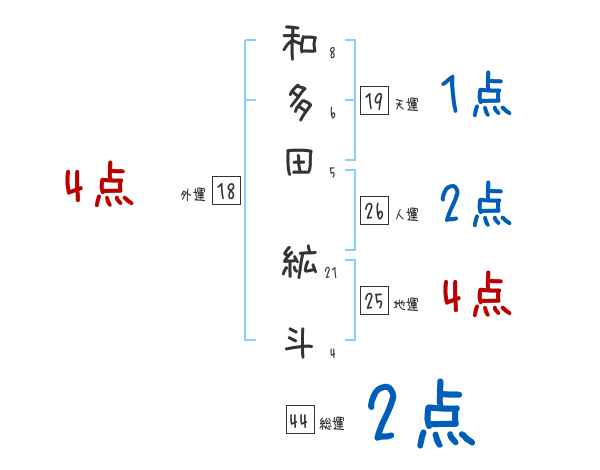 総運![]() | 和多田絋斗さんの総運は44画の2つ星!誠実で慎重な性格。物事を考えすぎないように注意しましょう。 あなたの人生を表す1番重要な運勢です。生涯を通じて影響する総合運となり、主に50歳以降の晩年期に影響を及ぼします。 |