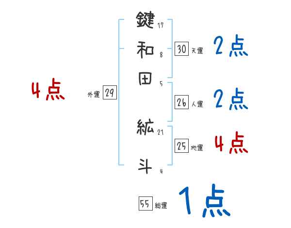 総運![]() | 鍵和田絋斗さんの総運は55画の1つ星!欲張りな性格で軽率な行動に注意しましょう。病気に気をつけて。 あなたの人生を表す1番重要な運勢です。生涯を通じて影響する総合運となり、主に50歳以降の晩年期に影響を及ぼします。 |