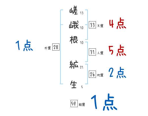 天運![]() | 嵯峨根絋生さんの天運は33画の4つ星!権力志向でプライドが高い。勇気があり運を切り開き成功する。 家系が持つ宿命的な運勢を表します。祖先から受け継いだ苗字ですので自分の力が及びません。家柄を象徴します。 |