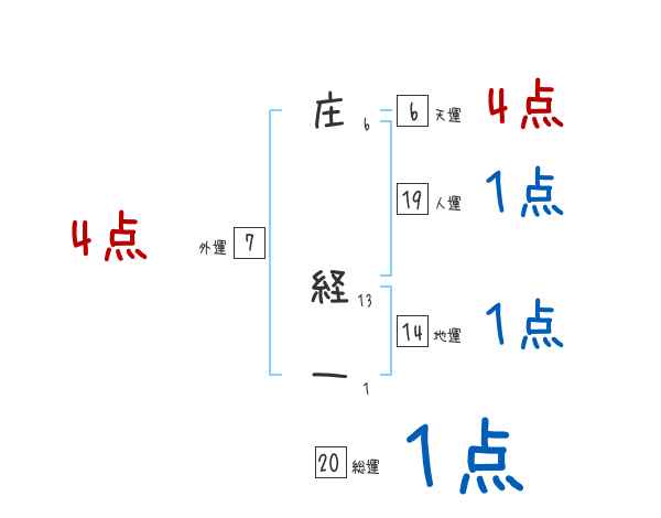 天運![]() | 庄経一さんの天運は6画の4つ星!慎重な努力家で信頼を得る。誠実な精神で向上心に優れる。 家系が持つ宿命的な運勢を表します。祖先から受け継いだ苗字ですので自分の力が及びません。家柄を象徴します。 |