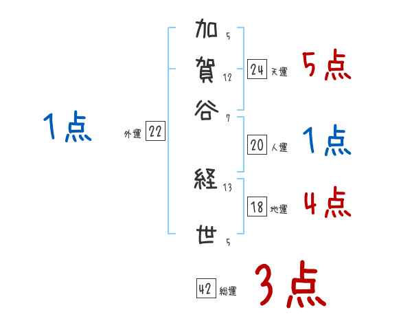 天運![]() | 加賀谷経世さんの天運は24画の5つ星!家庭運が良く順調な人生。金運にも恵まれる。 家系が持つ宿命的な運勢を表します。祖先から受け継いだ苗字ですので自分の力が及びません。家柄を象徴します。 |