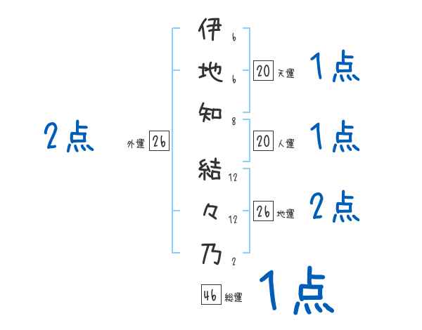 地運![]() | 伊地知結々乃さんの地運は26画の2つ星!波瀾万丈かも。信頼できる人を大事にしましょう。 個性を表す基礎的な運勢です。性格形成や対人関係、行動力など家庭環境に影響されます。主に誕生してから20歳くらいまでの若年期の運勢を表します。 |