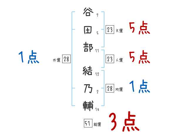 天運![]() | 谷田部結乃輔さんの天運は23画の5つ星!想像力に優れ活力がある。一代で成功し名誉を手に入れる。 家系が持つ宿命的な運勢を表します。祖先から受け継いだ苗字ですので自分の力が及びません。家柄を象徴します。 |