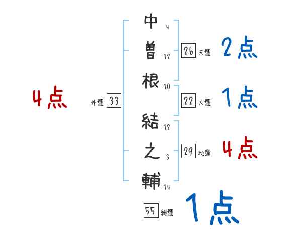 外運![]() | 中曽根結之輔さんの外運は33画の4つ星!権力志向でプライドが高い。勇気があり運を切り開き成功する。 生活面を象徴する運勢です。外部から受ける影響力を表し、結婚運、家庭運や職場、環境への順応性を表します。 |